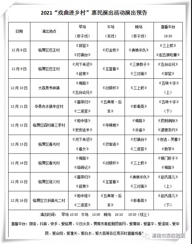 入冬時節,我們輾轉渭南各區縣村委會為大家進行精彩的演出活動,演出內容豐富多彩,請各位村民和戲迷朋友們提前關注預告,前去觀看。天氣轉涼,記得添加好衣物,叫上鄰里,一起來村委會觀看吧~