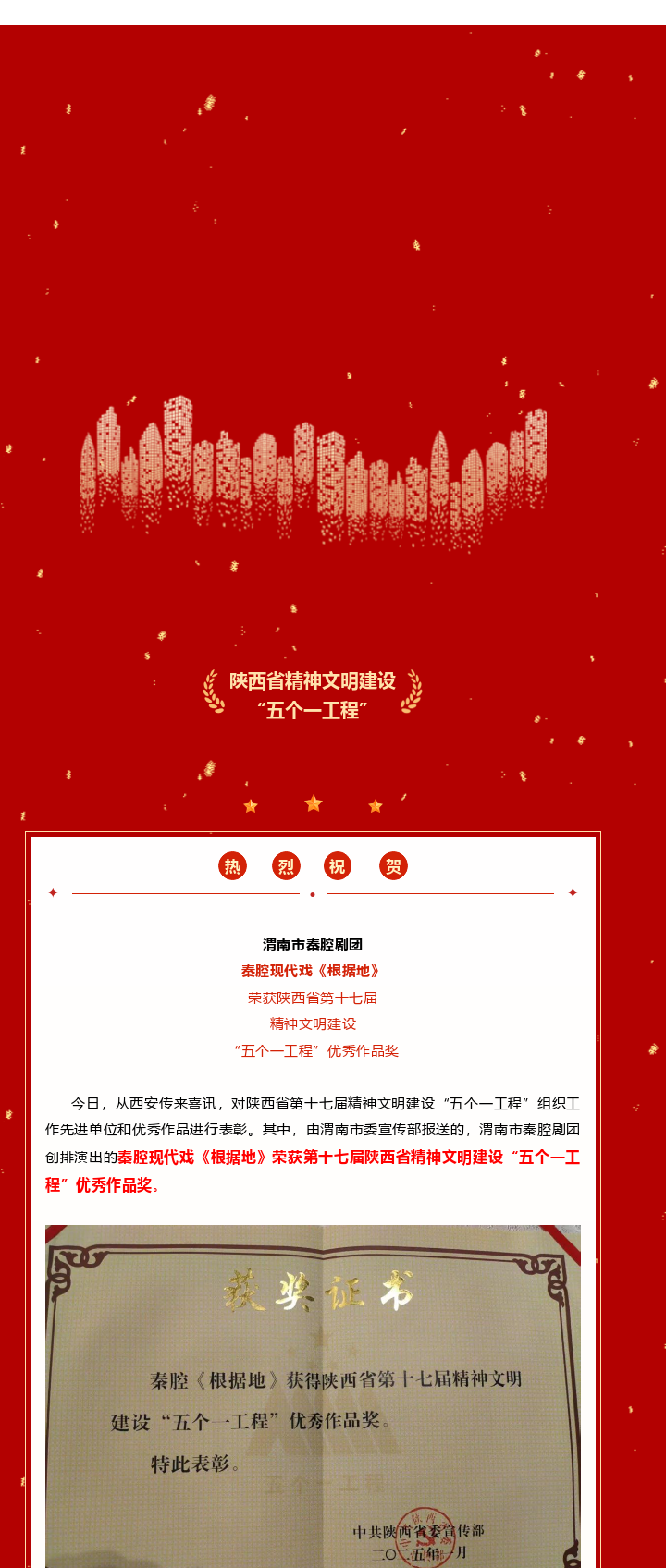 秦腔現代戲《根據地》榮獲陜西省第十七屆精神文明建設“五個一工程”優秀作品獎!
